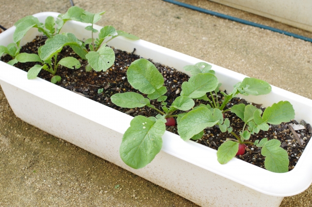 深さ15〜20cmあれば、ラディッシュや小松菜、ベビーリーフは十分育ちます。底に穴が開いていて、水はけの良いものを選びましょう。大きさに迷ったら、少し大きめを選んでおくと、野菜がのびのび育ちますよ。